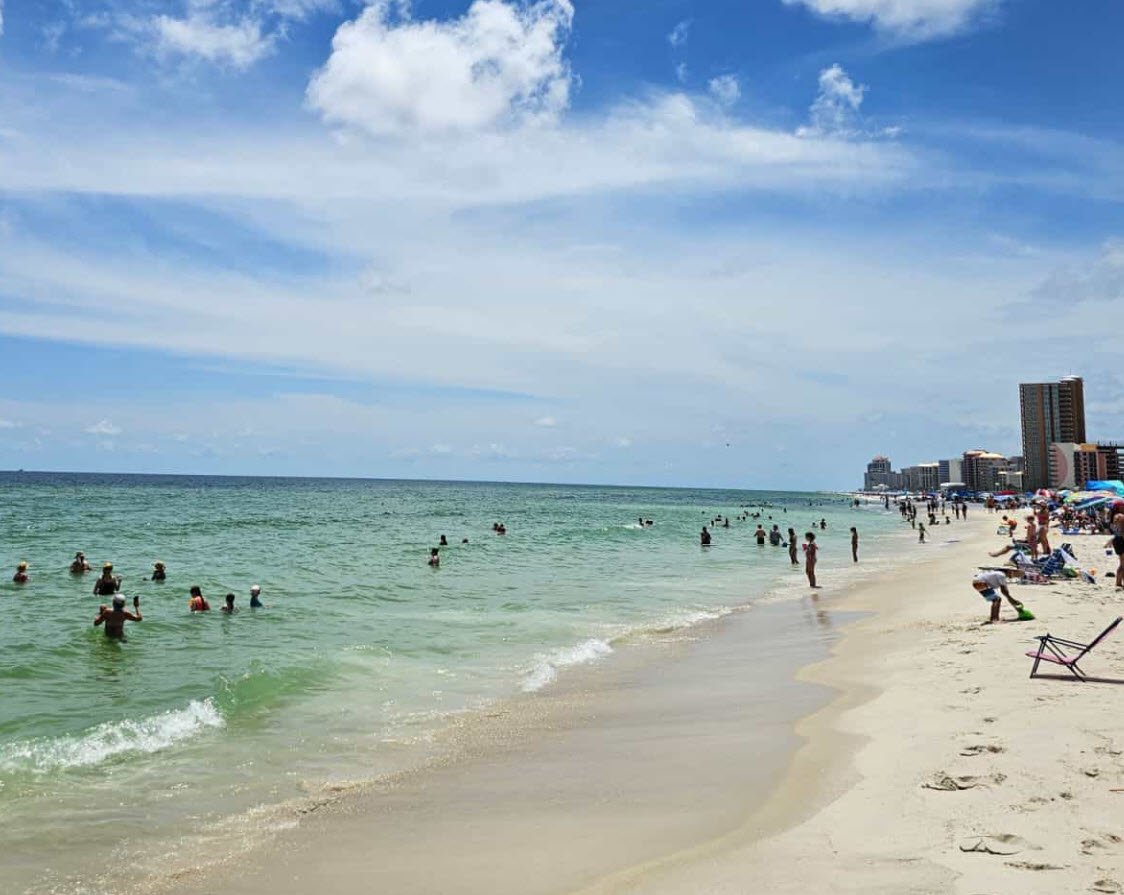 Gulf Shores Public Beach in Alabama is a popular destination known for its mile-long stretch of soft, white sand and clear blue waters along the Gulf of Mexico.