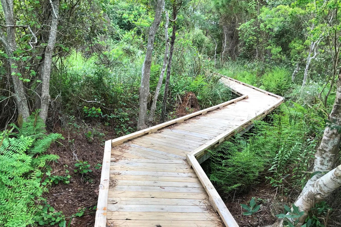 Gulf State Park in Alabama opened in 1939 as one of the state's first parks, with facilities initially built by the Civilian Conservation Corps during the Great Depression. The park spans approximately 6,500 acres and features a two-mile white sand beach on the Gulf of Mexico, freshwater lakes, coastal marshes, pine forests, and extensive hiking and biking trails.