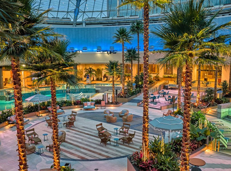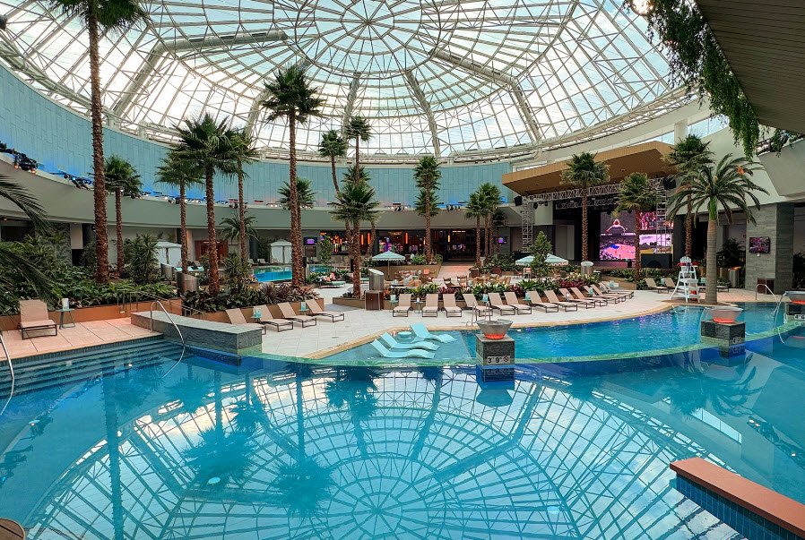 It features over 2,300-2,500 slot machines and video poker options, around 47-50 table games including blackjack, a modern sportsbook, keno, and the Bonanza Bucks progressive jackpot starting at $20,000, alongside a 252-room luxury hotel, full-service spa, the 32,000-square-foot Wawyé Oasis entertainment complex with multiple pools, swim-up bar, cabanas, and live music, plus dining at Shkodé Chophouse, CBK brewery-inspired spot, 131 Sportsbar & Lounge, and Harvest Buffet.