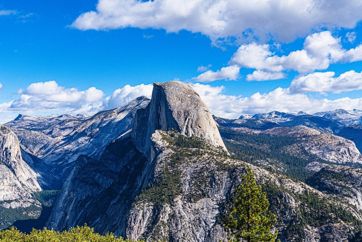 Its unique shape features three smooth, rounded sides and one sheer vertical face, giving it the appearance of a dome that has been sliced in half. Formed millions of years ago from quartz monzonite, Half Dome is a popular, iconic landmark within the park visible from many viewpoints and is renowned for its challenging hiking trail that climbs nearly 4,800 feet in elevation gain over 14-17 miles.
