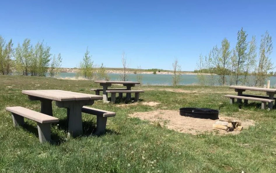 Managed by Wyoming State Parks since 1987, it offers 24 primitive walk-up campsites with picnic tables and fire rings, a boat launch ramp and dock for fishing walleye, largemouth bass, and crappie, plus restrooms, a playground, and seasonal potable water.