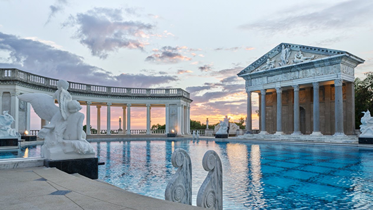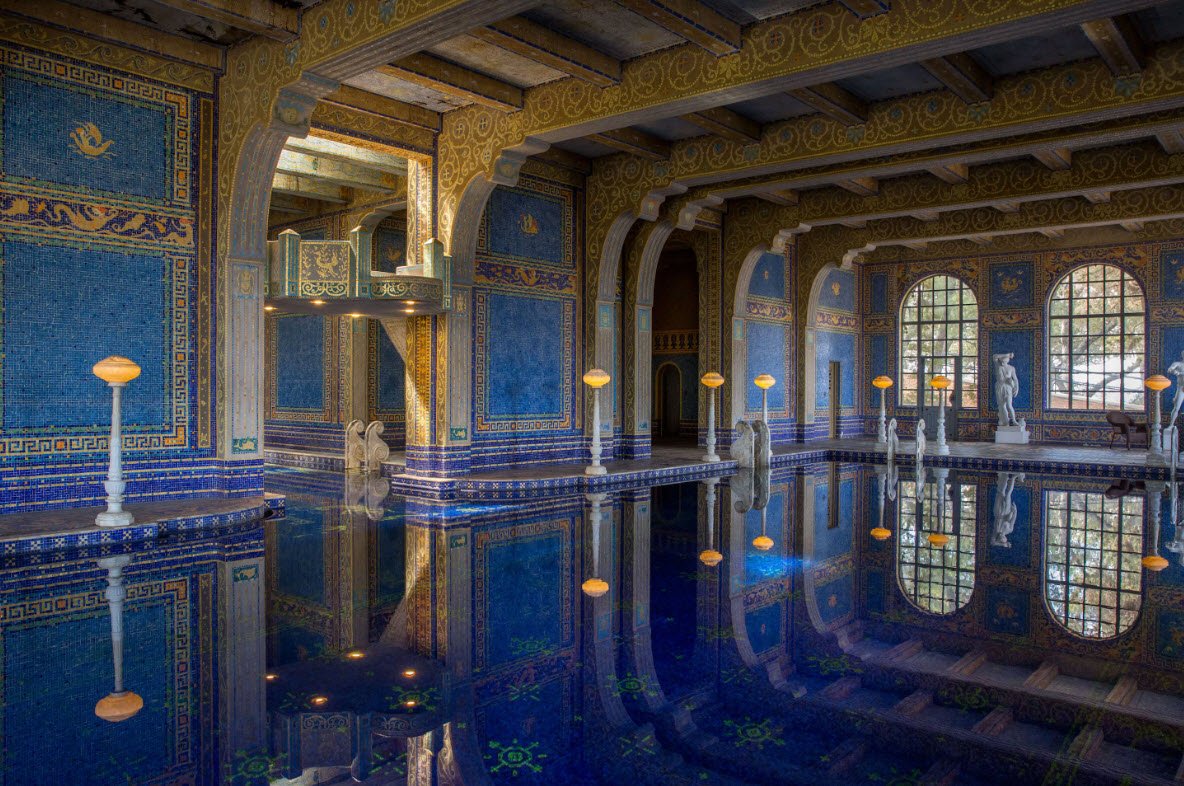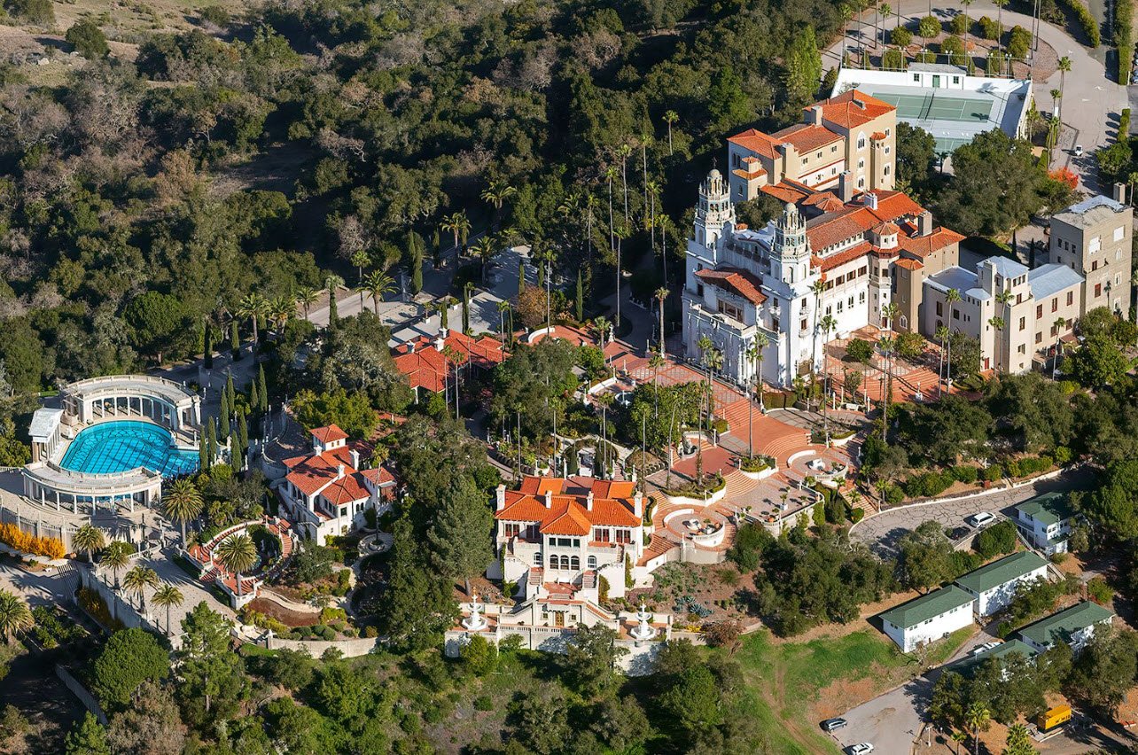 The castle features 165 rooms, 127 acres of gardens, ornate pools including the Neptune Pool, terraces, and walkways. Hearst amassed a legendary art collection displayed throughout the estate, including Egyptian, Greek, Roman antiquities, Renaissance ceilings, and European paintings. Famous for hosting Hollywood stars and political dignitaries, the estate became a California State Park and museum in 1958.