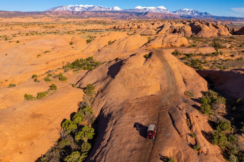 The route traverses slickrock sandstone fins, steep climbs, descents, and rocky ledges, offering breathtaking panoramic views of the surrounding red rock landscapes, the Colorado River canyon, La Sal Mountains, and Arches National Park. Highlights along the trail include dramatic obstacles like "Hell's Gate," a steep narrow climb known for its difficulty and risk of rollovers.