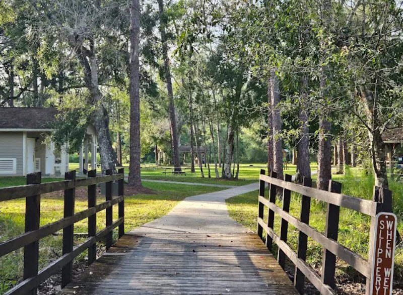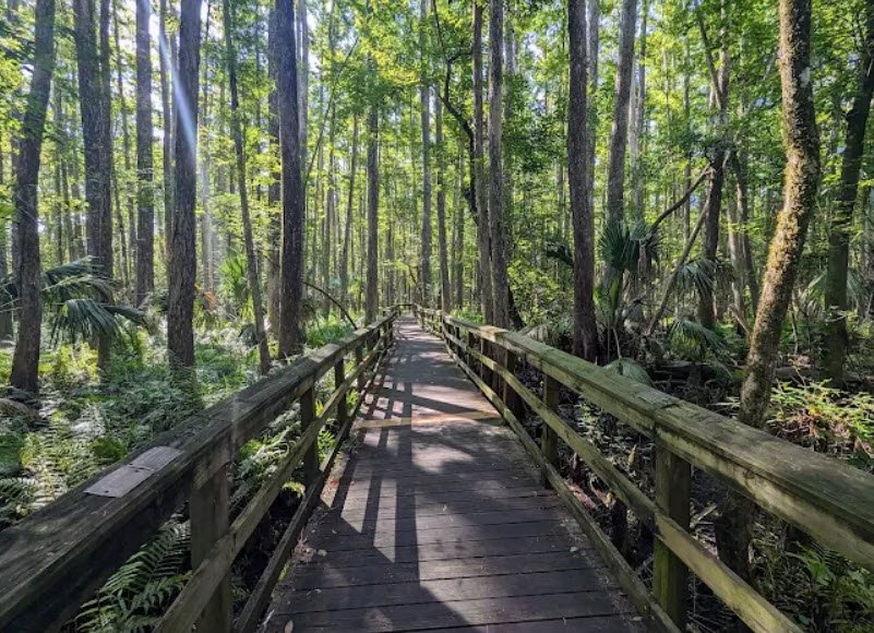 Elevated boardwalks guide visitors through misty cypress swamps filled with towering trees, cypress knees, ferns, and palms reflected in shallow waters. Activities include nine scenic hiking trails like the Cypress Swamp and Ancient Hammock Trails, a 3-mile paved bike loop, guided tram tours, an 11-mile equestrian trail, camping options from primitive to RV sites, a museum on CCC history, picnicking, and wildlife viewing in this lush, jungle-like "Real Florida" refuge open daily from 8 a.m. to sundown.