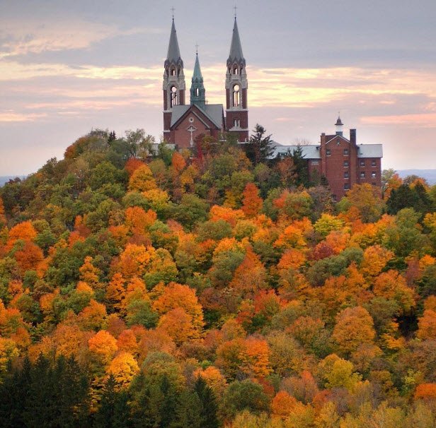 It sits atop a glacial kame, offering scenic views from an observation tower. The current Romanesque Revival church was completed in 1931 after earlier wooden chapels and shrines on the site, and it attracts about 500,000 pilgrims and visitors annually. The hill was initially known as Government Hill before becoming a religious site where a hermit named François Soubrio lived.