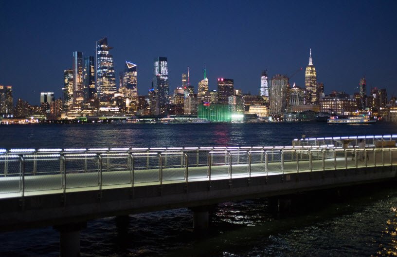The Hudson River Waterfront Walkway in New Jersey stretches about 18.5 miles along the western shore of the Hudson River from Bayonne near the Bayonne Bridge north through Jersey City, Hoboken, Weehawken, West New York, Guttenberg, North Bergen, Edgewater, and Fort Lee up to the George Washington Bridge.