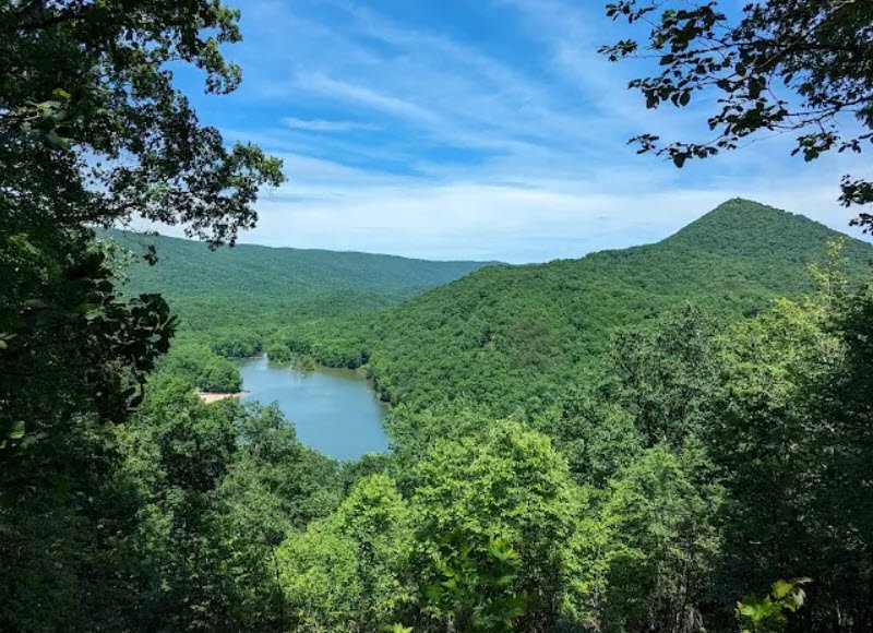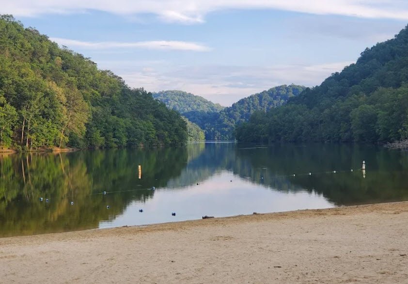 Nestled in mountainous terrain at about 2,227 feet elevation amid mixed hardwood forests, rhododendron thickets, hemlock ravines, and grasslands, it offers 18 miles of trails for hiking and biking with lake views and abundant wildlife like nesting warblers. Activities include swimming, boating with rentals for canoes, kayaks, paddleboards, and hydrobikes, fishing from an accessible pier, camping, cabin and yurt stays, picnicking, a conference center, and interpretive programs.