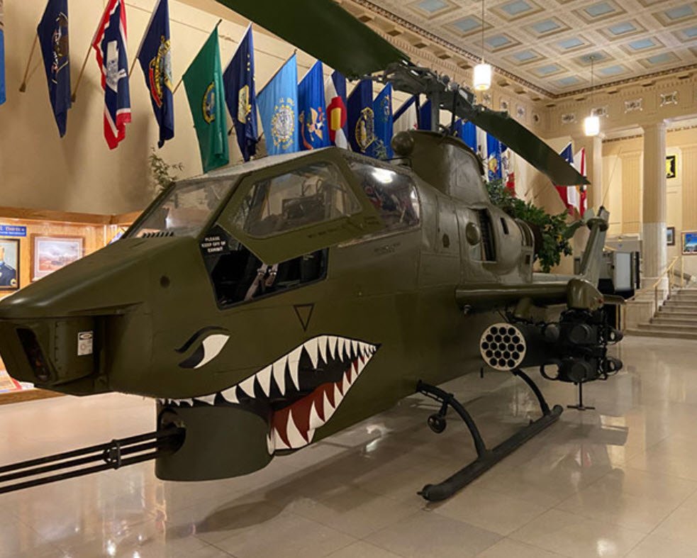 The memorial features a 210-foot-tall tower with Ionic columns inspired by Greek architecture and includes a Shrine Room known for its grandeur. The museum inside offers free admission and displays over 400 military flags, uniforms, weapons including an AH-1 Cobra helicopter, and a recreation of the USS Indianapolis radio room. The building also houses the Pershing Auditorium and meeting spaces, serving as a cultural and educational center.