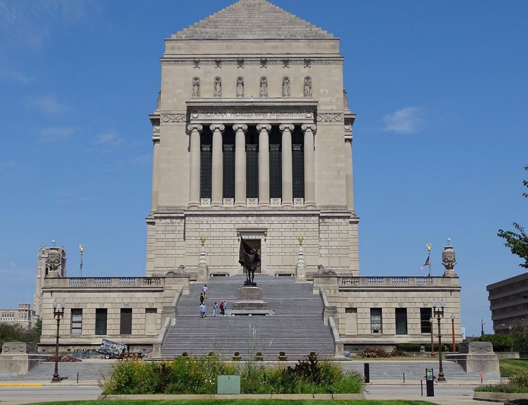The Indiana War Memorial and Museum in downtown Indianapolis is a neoclassical structure completed in 1933, dedicated to honoring Indiana’s military veterans from the Revolutionary War through modern conflicts.