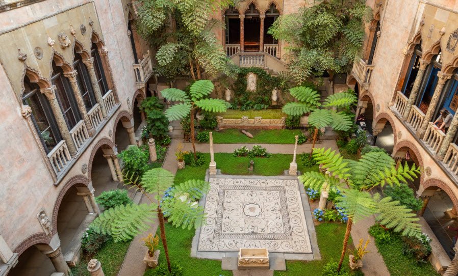 The museum was designed by architect Willard T. Sears in the style of a 15th-century Venetian palace, reflecting Gardner’s love for Italy and Venice. Its architecture emphasizes an atmospheric setting with a central courtyard filled with sculptures, fountains, and lush garden spaces, creating an immersive environment that blends art with architecture. The collection includes European paintings, sculptures, textiles, and decorative arts, many arranged to resemble a private residence, echoing Gardner's vision of a "living museum."