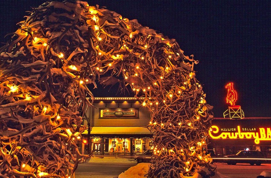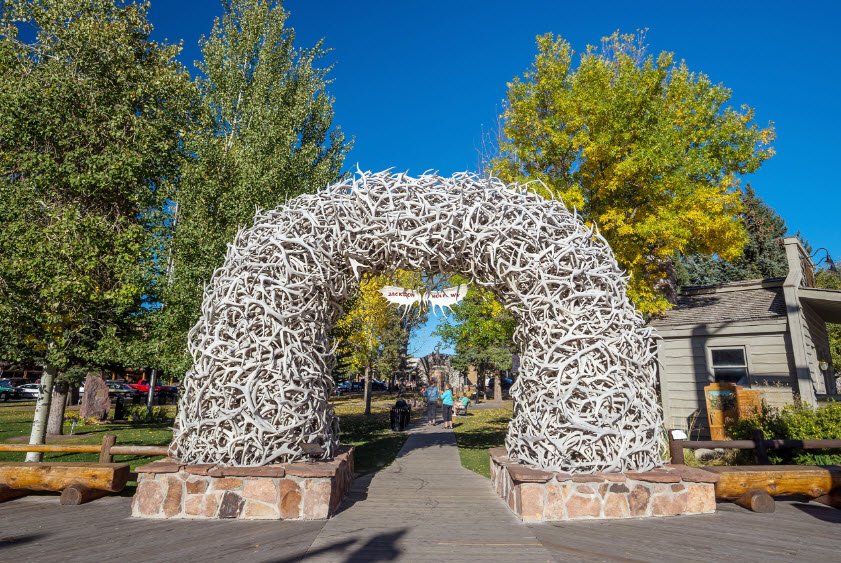 Dedicated as a park in 1934, it is famous for its four large elk antler arches standing at each corner, made from antlers naturally shed by elk in the nearby National Elk Refuge, collected and assembled by local Boy Scouts and community members. The square features an open grassy area with a stone memorial honoring local veterans at its center.