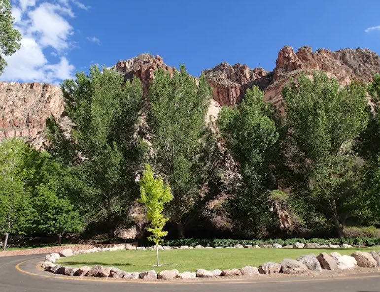 The park sits tucked into high desert terrain with rugged, rainbow‑hued cliffs rising up to about 700 feet, while the canyon floor stays cool and green thanks to natural springs that feed wild grapevines, Gambel oaks, cottonwoods, orchards, and a small wading pool and pond.