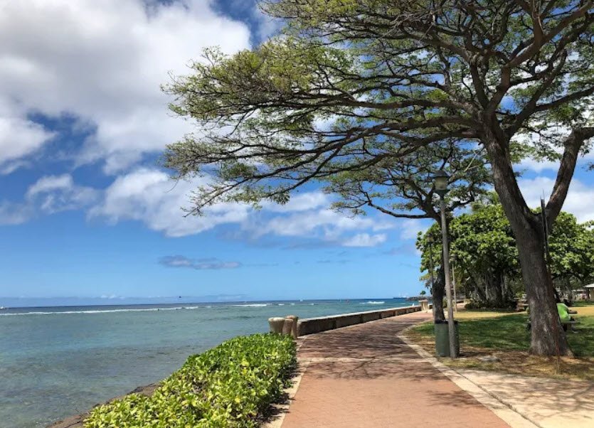 Adjacent to Ala Moana Regional Park, it offers free parking, showers, restrooms, benches, and paved paths for strolling amid coastal breezes with postcard views of Diamond Head, Waikīkī Beach, and harbor boats including fishing charters and excursion catamarans.