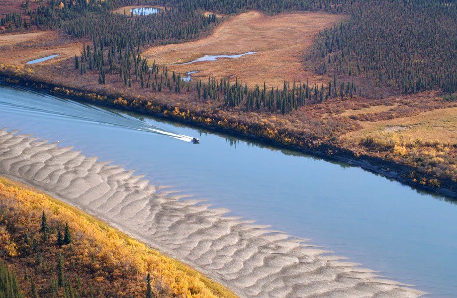 The river passes through diverse landscapes including mountain canyons, boreal forests, wetlands, and a broad delta, supporting significant populations of wildlife such as caribou, sheefish, and various bird species.