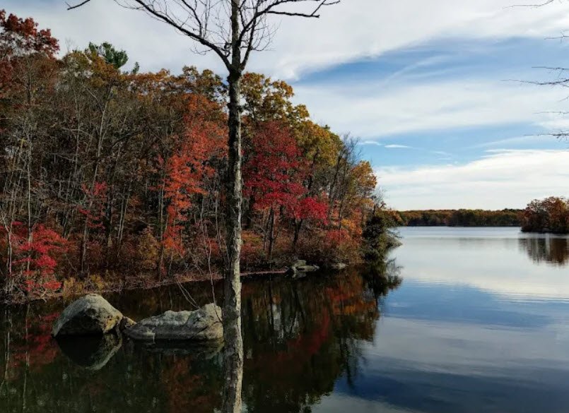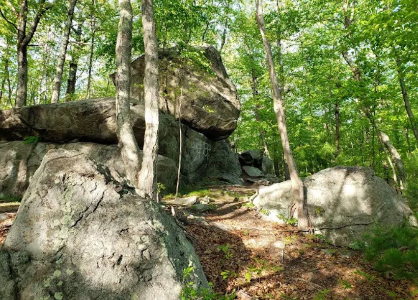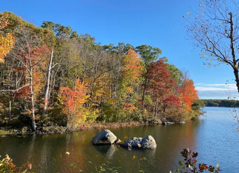Lincoln Woods State Park covers 627 acres around Olney Pond in Lincoln, Rhode Island, just northwest of Pawtucket, renowned as the state's first state park established in 1909 amid giant glacial boulders and rugged terrain that preserved its natural character.