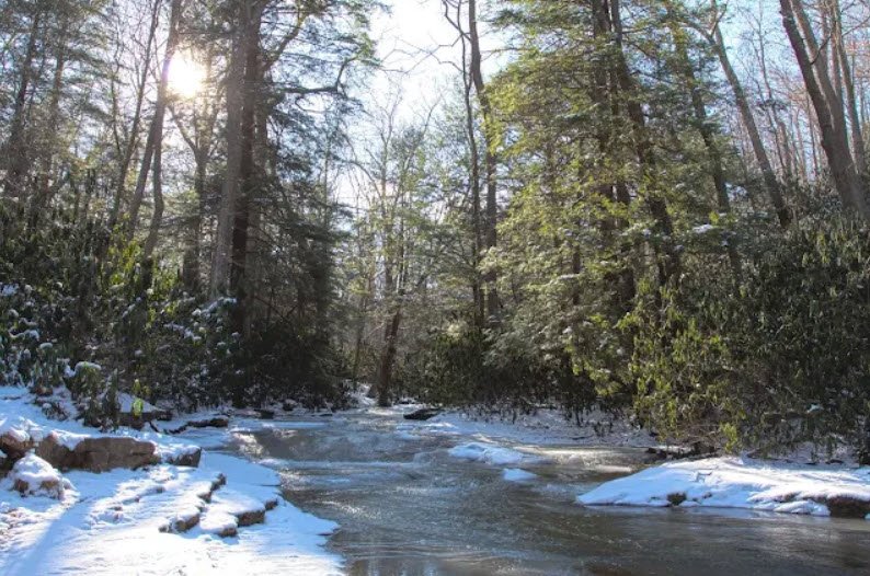 Grove Run and Rock Run converge here to form Linn Run, a prime native trout stream flowing through hemlock-hardwood forests, highlighted by the scenic 15-foot Adam Falls accessible near a picnic area with tables, grills, playgrounds, and restrooms. Visitors enjoy hiking trails like the 3.9-mile Grove Run Loop and connections to broader forest paths, rustic cabin rentals, fishing, hunting, horseback riding, and wildlife viewing in a peaceful, elevated mountain setting.