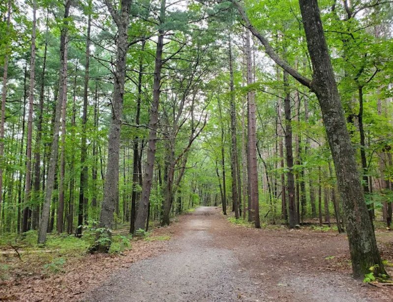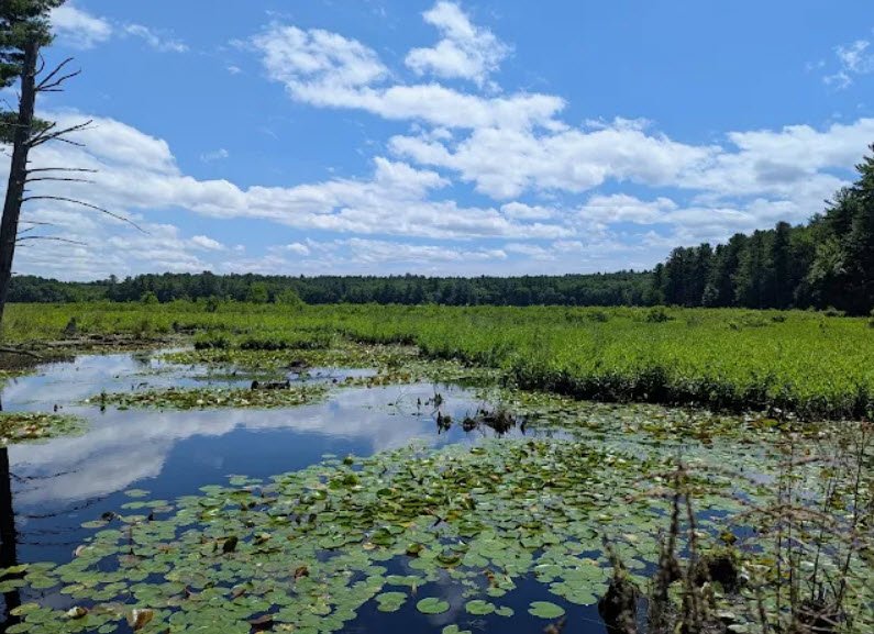 The forest includes about 180 acres of ponds, swamps, and wetlands, providing habitat for local wildlife and opportunities for fishing, boating, and nature observation alongside a network of roughly 6 miles of trails used for hiking, mountain biking, and cross‑country skiing.