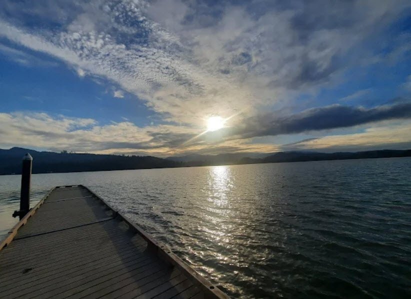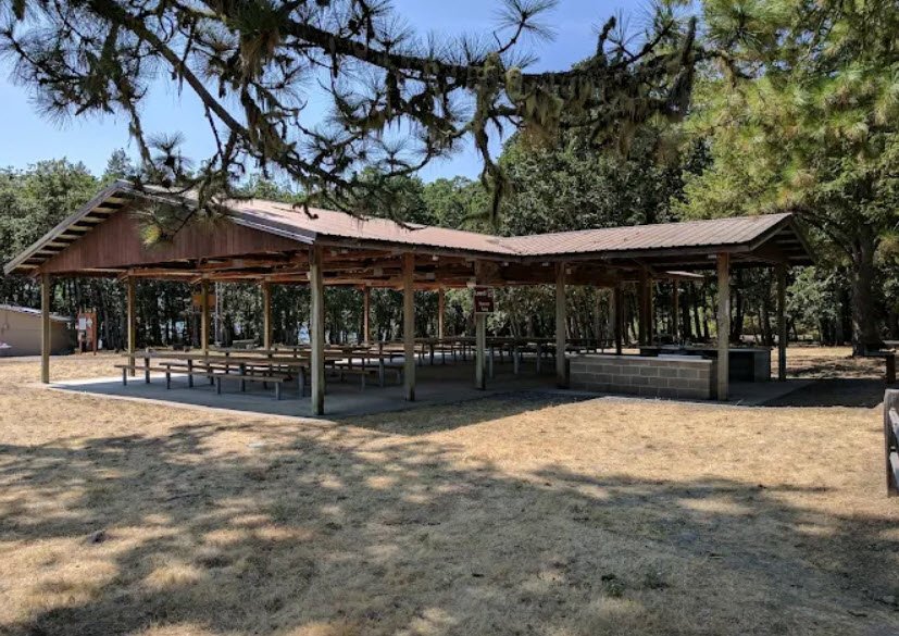 It features a reservable picnic shelter overlooking the lake with a covered kitchen, electricity, and seating for up to 150, plus wooded picnic areas, a playground, basketball court, flush restrooms, a large lawn sloping to a swim beach, and a marina with rentable moorage, a courtesy dock, and a four-lane boat launch for sailboats, water skiing, paddling, rowing regattas hosted by the Oregon Association of Rowers and University of Oregon, and summer drag boat races.
