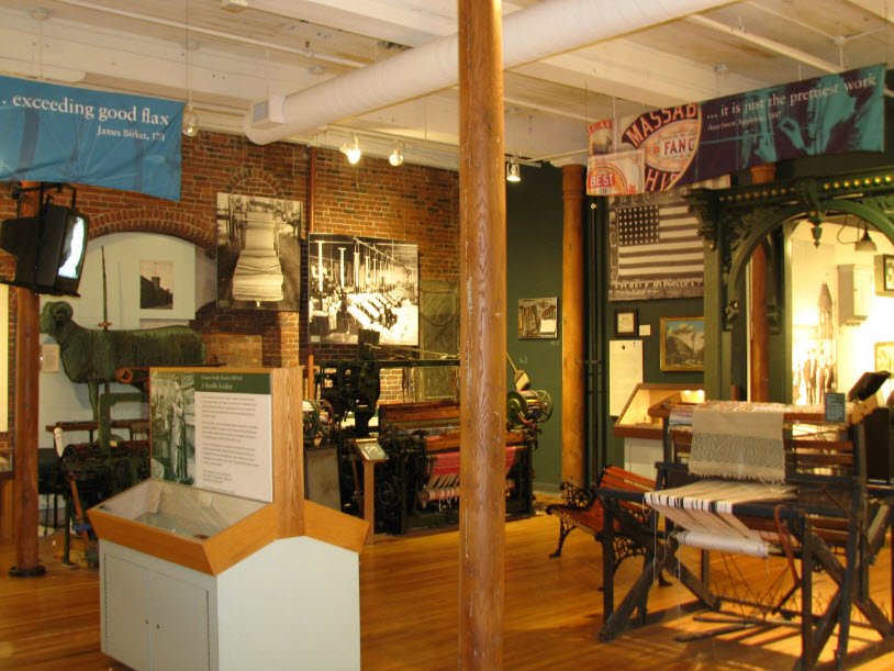 The permanent exhibit "Woven in Time" showcases the industrial era with artifacts, machinery, models of old streets, and stories of immigrant workers, mill girls, inventors, and the company's bankruptcy during the Great Depression. Rotating exhibits highlight local innovations, immigration, and manufacturing impacts, with audio tours and research center access available for deeper exploration of Manchester's transformation into a modern city.