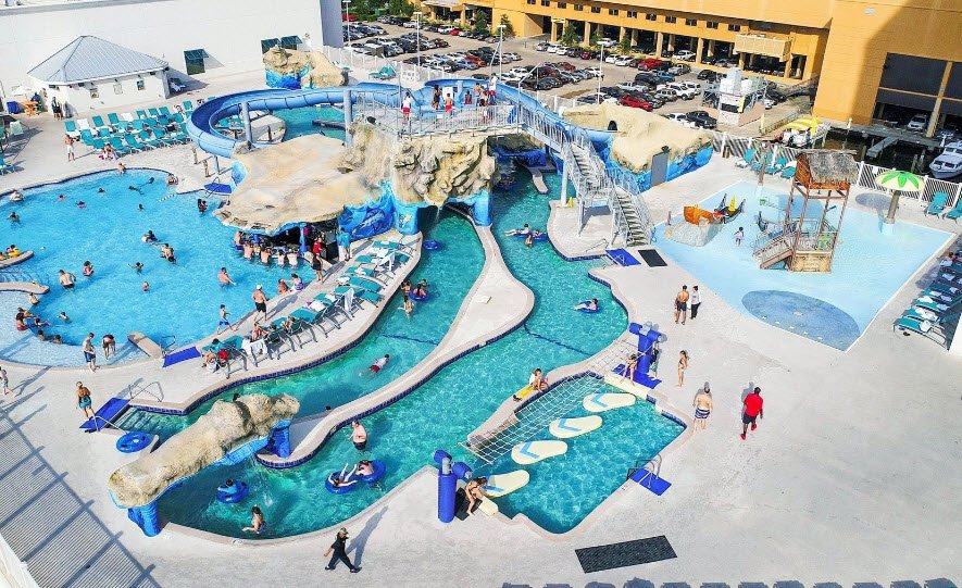 Margaritaville Resort Biloxi is a family-friendly beachfront resort in Biloxi, Mississippi, on the Gulf Coast, offering 373 spacious coastal-luxe rooms and suites with views of the Mississippi Sound, a 450-foot lazy river, outdoor pool, waterslides, ropes course, swim-up bar, and the largest arcade in the country with over 200 games.