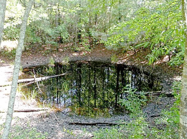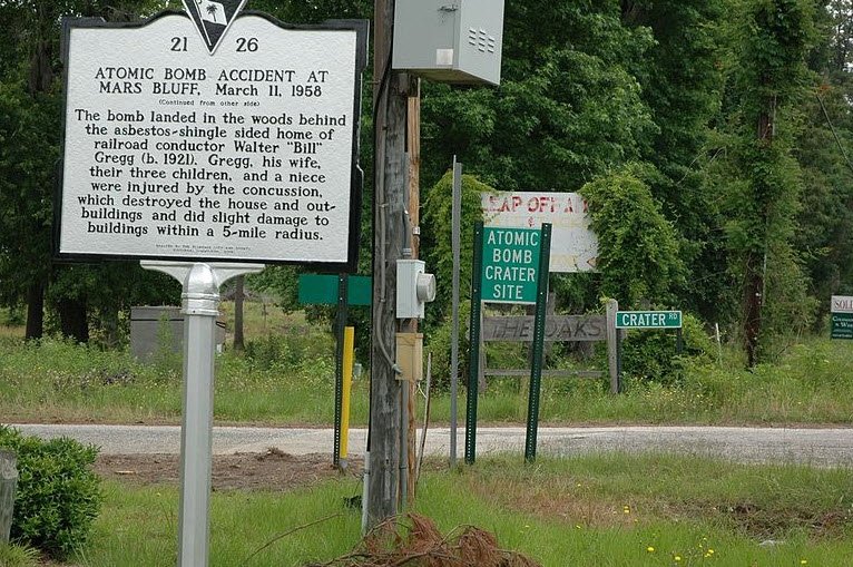 Mars Bluff Atomic Bomb Impact Crater in South Carolina marks the site where, on March 11, 1958, a U.S. Air Force B-47 accidentally dropped an unarmed atomic bomb on the backyard of the Gregg family during a training flight.