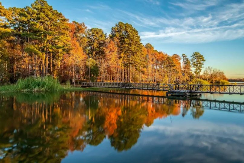 Visitors enjoy nearly 5 miles of hike-and-bike trails like the 2-mile Shortleaf Pine Trail, Old Henderson Road Loop, and Island Trails Loop to a primitive campsite via footbridge, plus camping in RV/tent sites and screened shelters, picnicking, and a quiet escape drawing 79,022 people in 2022.