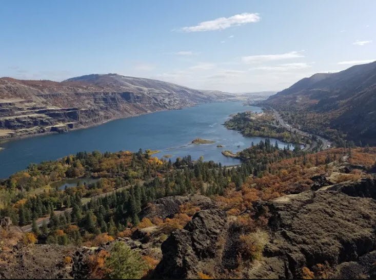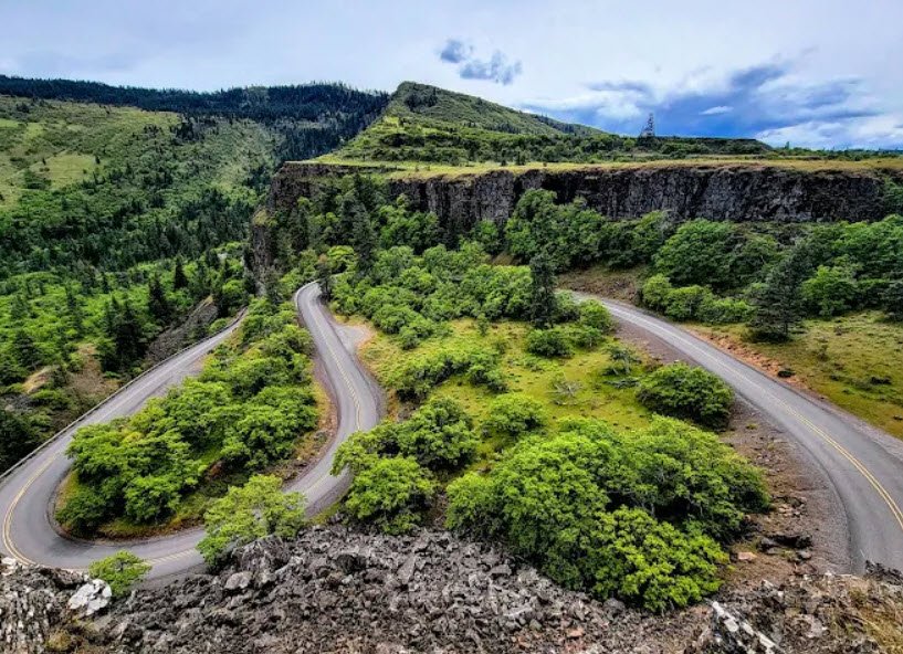 The park's highlight is Rowena Loops—paved Historic Columbia River Highway switchbacks climbing to panoramic Gorge vistas of basalt cliffs, the Columbia River, and seasonal wildflower meadows (March-April), all open year-round with a small day-use fee, vault toilets, and no camping.