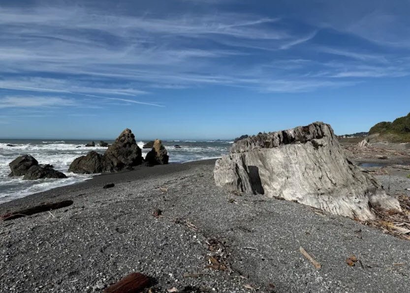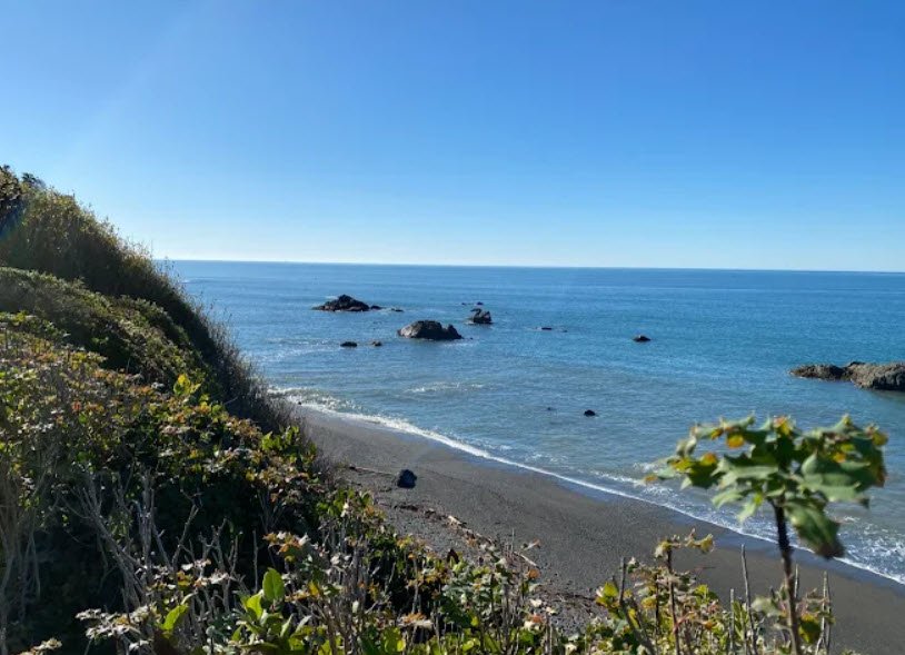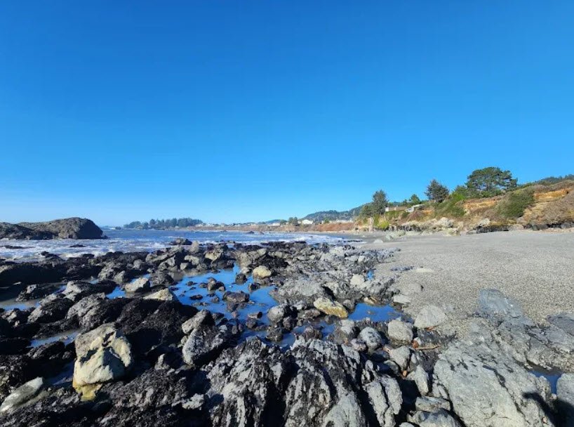 Amenities are minimal with just an outhouse restroom, making it a quiet uncrowded spot for picnics, beach walks extendable to Winchuck River mouth or Sporthaven Beach at minus tides, and seabird viewing amid stunning ocean vistas.