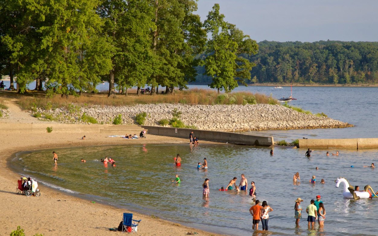 The lake has become a popular destination for fishing, boating, swimming, hiking, and camping, hosting nine state recreation areas including Fairfax, Paynetown, and Hardin Ridge, each offering amenities like boat ramps, beaches, campgrounds, and marinas.