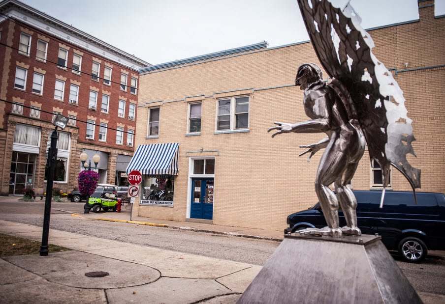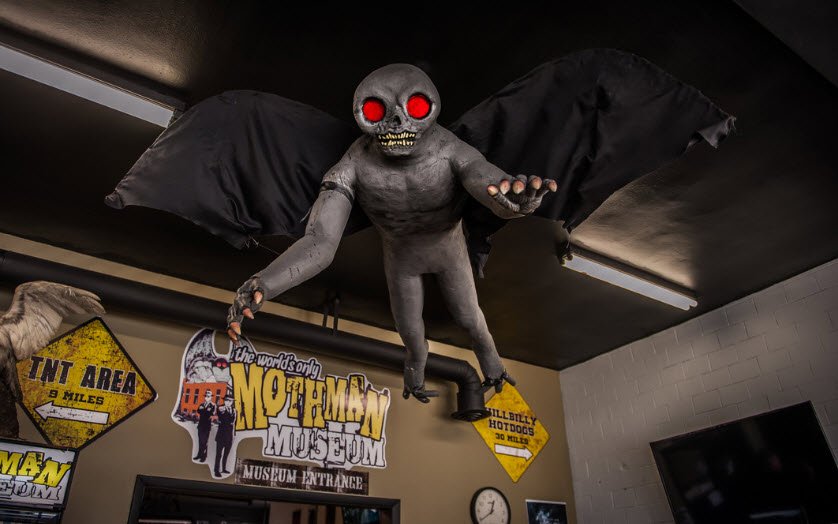 The Mothman Museum in Point Pleasant, West Virginia, is dedicated to the mysterious creature reportedly seen in the area between 1966 and 1967, characterized by its humanoid shape and glowing red eyes.