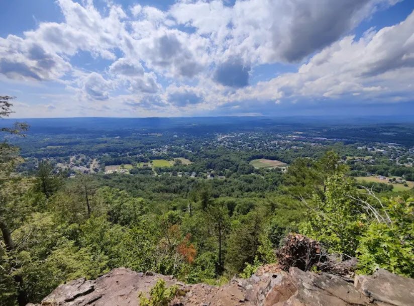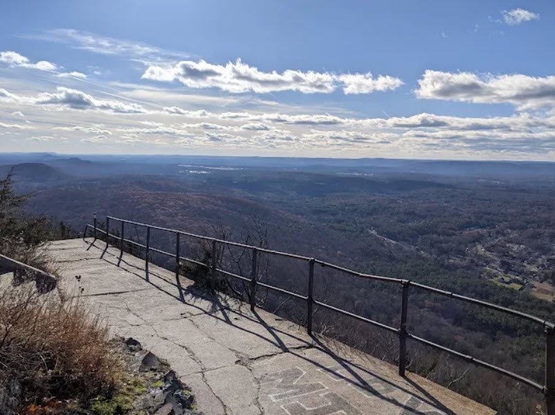Mount Tom State Reservation spans nearly 2,000 acres across Holyoke, Easthampton, and Hampshire County in Massachusetts' Pioneer Valley, encompassing the Mount Tom Range with its high cliffs, rugged terrain, lakes, forests, and panoramic views of the Connecticut River Valley.