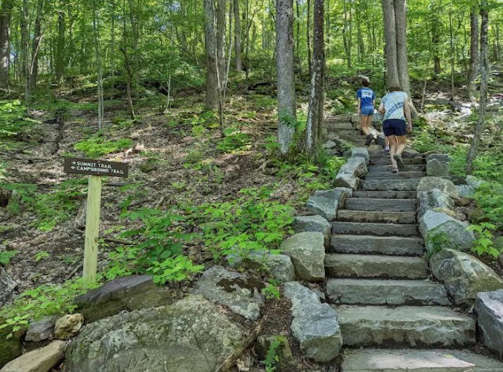 Visitors can drive the steep, narrow seasonal road to the summit for easy access to picnic areas with tables and grills, or hike the challenging 0.75-mile trail through forests for a rewarding workout amid boulders and wildflowers. The mountaintop also features short paths for strolling, accessible restrooms, a small campground with 10 sites including lean-tos and hot showers, and year-round appeal for birdwatching, sledding in winter, and quiet nature escapes open from Memorial Day to Columbus Day.