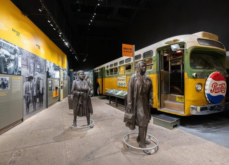 Key highlights include the preserved Room 306 where Dr. King stayed, a replica of the Supreme Courtroom involved in the Brown v. Board of Education case, and exhibits on pivotal events such as the Montgomery Bus Boycott.