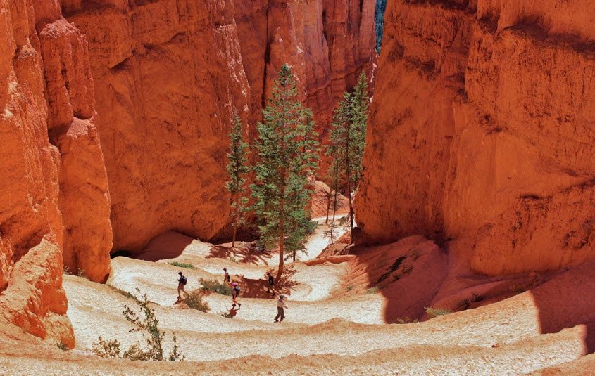 It descends 800 feet from the rim into the canyon, winding through narrow limestone corridors known as Wall Street with towering rock walls and dense Douglas-fir trees. Along the trail, hikers see iconic hoodoos including Thor's Hammer and pass through areas called Silent City and Two Bridges.