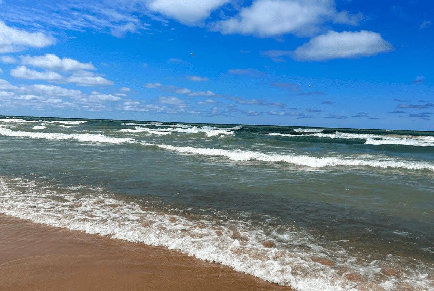 New Buffalo Beach is conveniently close to downtown shops, restaurants, and farmers markets, making it a lively yet relaxing destination known for its scenic views, warm community vibe, and beautiful sunsets over Lake Michigan.