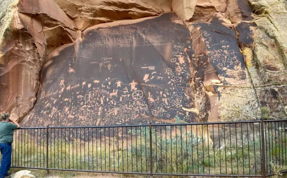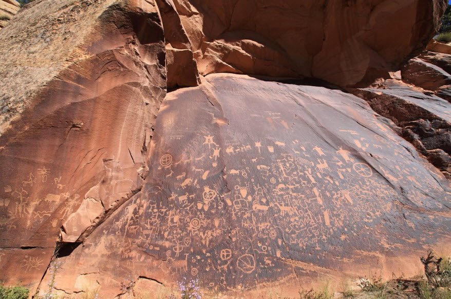 These petroglyphs depict human figures, animals, hunting scenes, geometric designs, and symbols that are believed to have served as a form of communication or storytelling. The rock is also known by its Navajo name "Tse' Hone'," meaning "rock that tells a story."