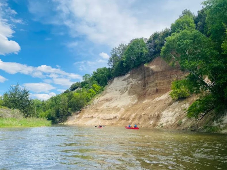 The park sits on wooded river bluffs that provide sweeping views of the two rivers and the surrounding plains, with a mix of forested hills and open prairie habitat. It offers cabins, both RV and tent camping, a supervised swimming pool, horseback trail rides, miles of hiking, biking, and equestrian trails, fishing, wildlife watching, and a small visitor center, while the famous buffalo cookouts are held on selected summer evenings.