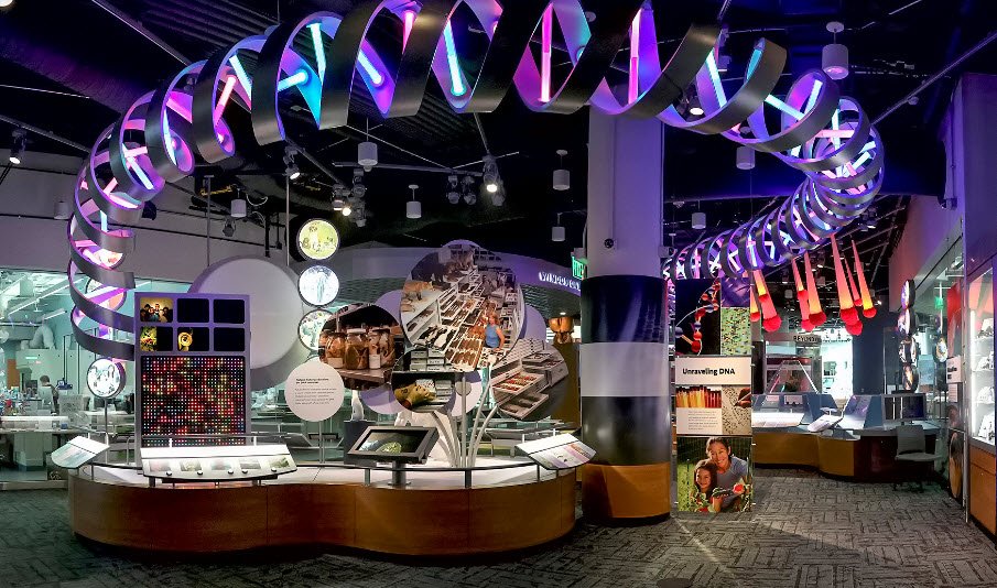 Free general admission draws over a million visitors yearly to four floors of exhibits on North Carolina's coasts, mountains, prehistoric life like the world-only Acrocanthosaurus skeleton, a 10,000-gallon aquarium, SECU Daily Planet globe theater, and real-time scientist observations in open labs.