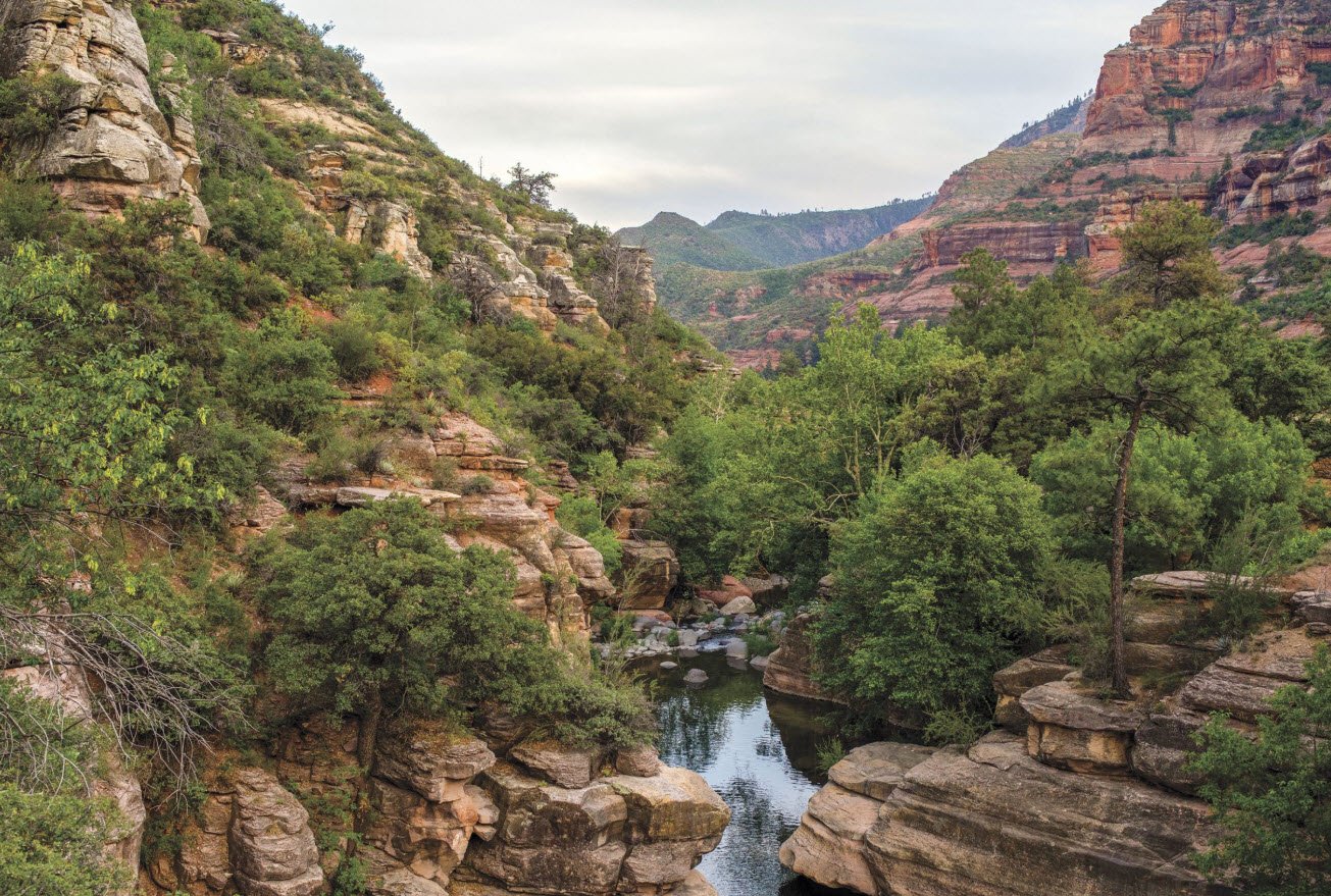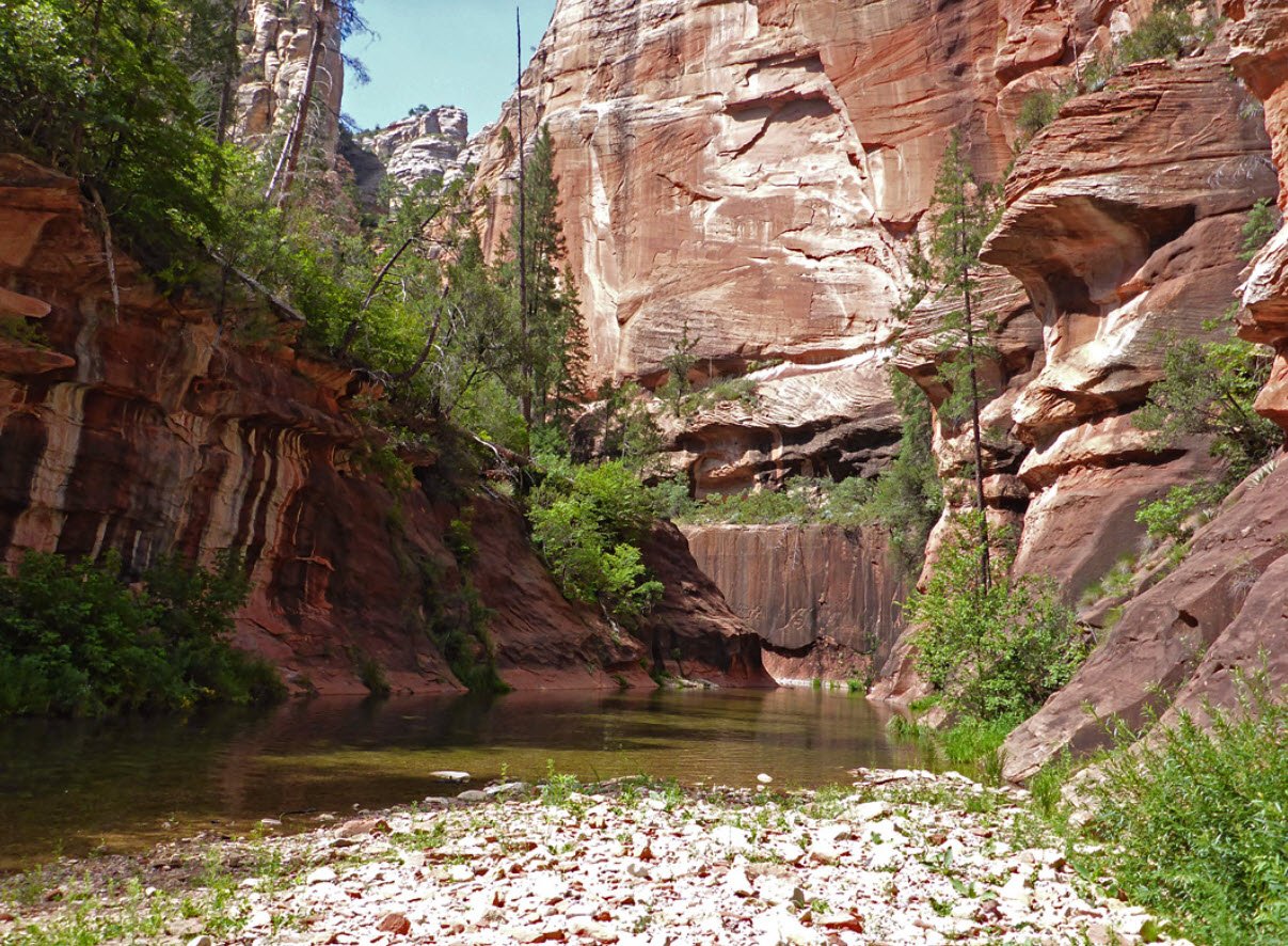 Stretching about 12 miles, the canyon features towering red rock walls that range from 800 to 2,000 feet high, carved by Oak Creek, which runs through the canyon floor. It offers a lush contrast to the surrounding desert with dense oak trees, vibrant seasonal foliage, and cool swimming and fishing spots along the creek.