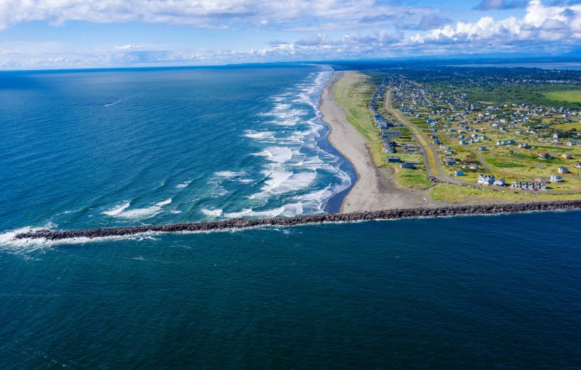 Ocean Shores Beach in Washington stretches along an 8-mile-long peninsula on the Pacific coast, offering expansive sandy shores that are popular for a variety of outdoor activities.