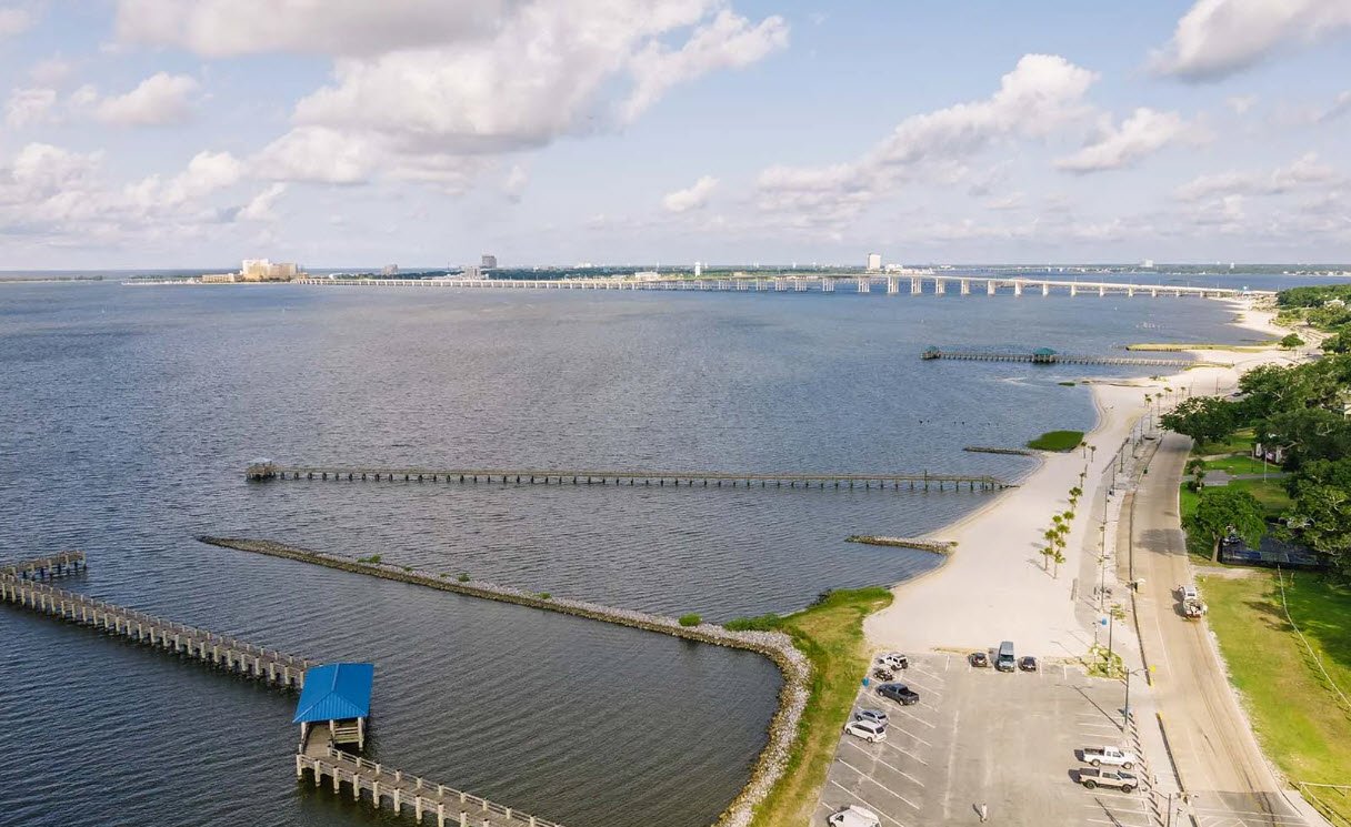 Front Beach is near the Ocean Springs Yacht Club and includes amenities like fire pits, volleyball nets, fitness equipment, and a fishing pier, making it popular for relaxation and outdoor activities. East Beach stretches for about three miles, offering shallow, calm waters ideal for swimming and leisurely strolls.