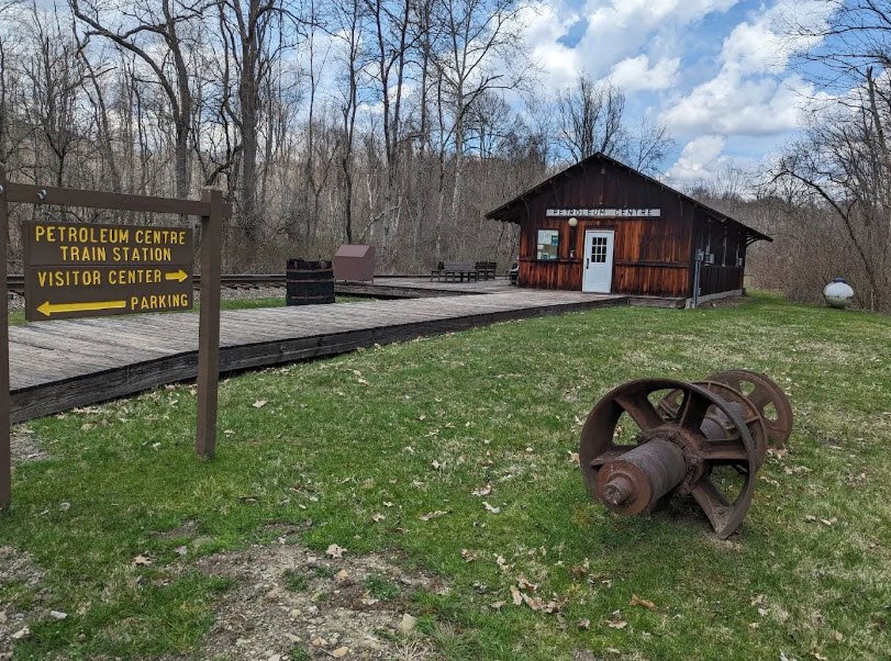 The park features a scenic valley with deep hollows, steep hillsides, and wetlands, offering a 9.7-mile paved trail for hiking and biking, 36 miles of backpacking trails including the Gerard Hiking Trail, canoeing, fishing, and an excursion train ride. Visitors explore historic oil boomtown sites like Petroleum Centre, museums with tableaux of early derricks and transportation, modern camping, picnicking, and wildlife viewing amid forested hills now dotted with gas wells.