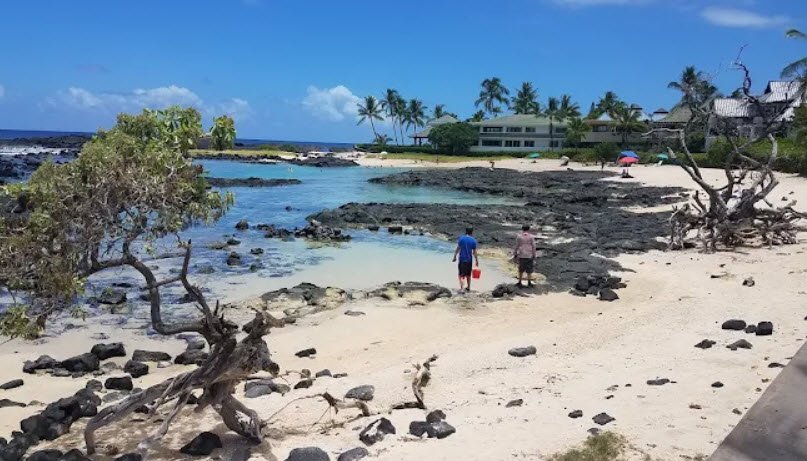 Old Kona Airport State Recreation Area is a 104-acre beach park on the former site of Kona's original 1940s airport runway, now repurposed north of Kailua-Kona on Hawaiʻi Island, Hawaii, USA, featuring a long sandy beach with tide pools, keiki ponds, and rocky shoreline ideal for family exploration.