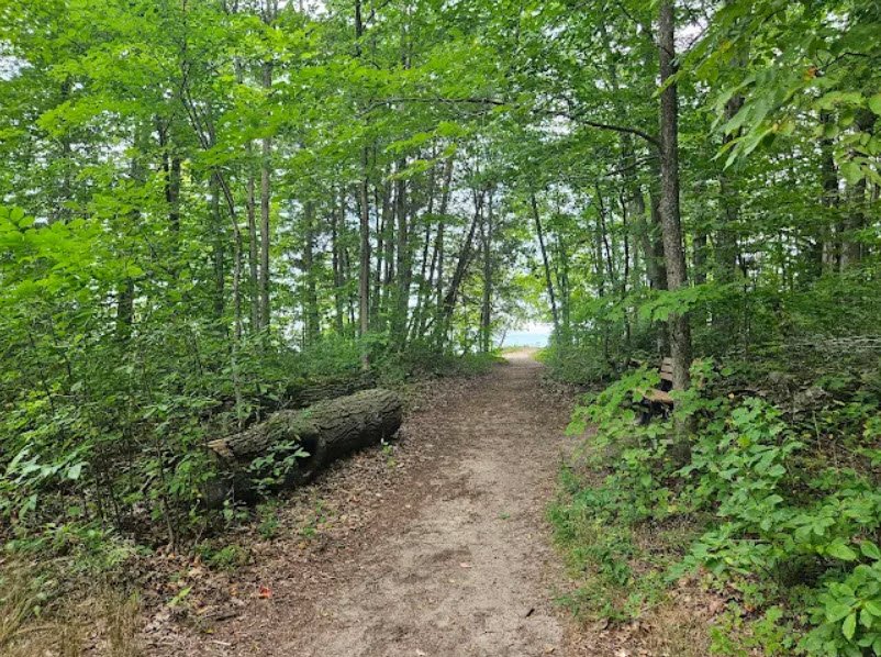 The roughly 40‑acre park sits on former orchard and forest land, with several miles of mostly flat, easy‑to‑walk trails that run through woods and open lanes and connect to the adjacent Mission Point Lighthouse Park. The park offers coastal views, quiet walking or hiking, and a peaceful setting near the historic Mission Point Lighthouse, though it emphasizes day‑use trails and scenery rather than camping or large beach amenities.