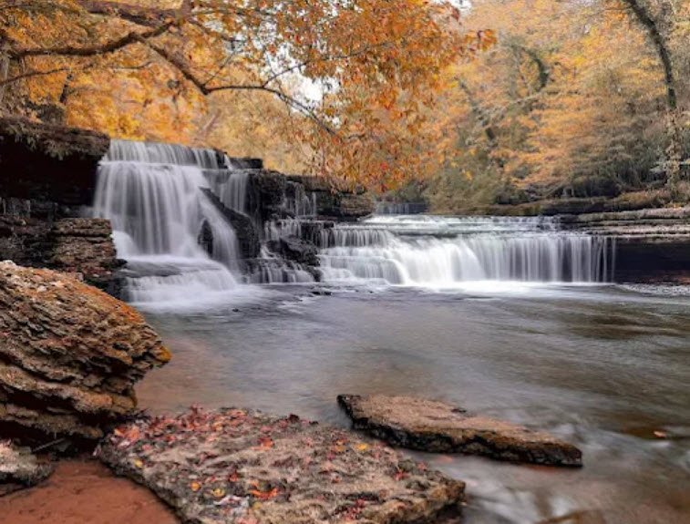 Once speculated as a European fort, excavations confirmed its prehistoric origins with no habitation artifacts, later serving as a landmark for settlers, hunters, and the 1794 Nickajack Expedition against Cherokee. The 135-acre park offers a museum with exhibits, 10 miles of hiking trails to waterfalls like the 30-foot Upper Falls, primitive camping, picnicking, and ranger programs amid scenic gorges and forests.