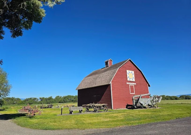 The site features a restored log cabin, 1908 red hay barn, outbuildings, antique farm equipment, interpretive trails through fields and woods, picnic areas, and wildlife viewing, offering a living museum of central Washington agriculture added to the National Register of Historic Places in 1971.