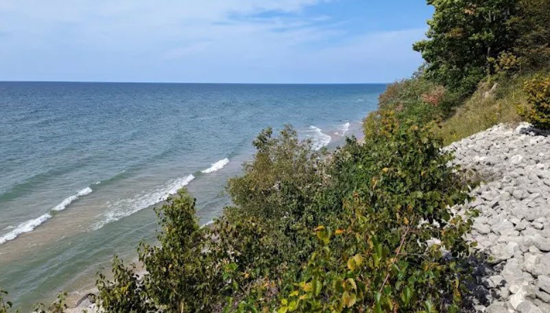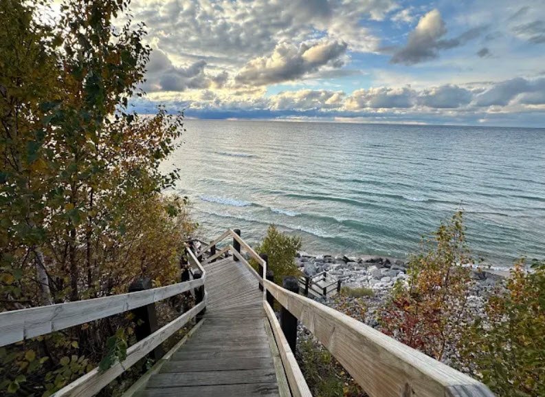 The park is known for its sweeping views of sunsets and the big lake, rather than direct beach access, because high water and erosion have closed the stairway path down to the sandy shoreline. Visitors can enjoy more than three and a half miles of trails through old‑growth forest and former farmland, explore a historic limestone “shelter” building built by the Civilian Conservation Corps and since relocated and restored.