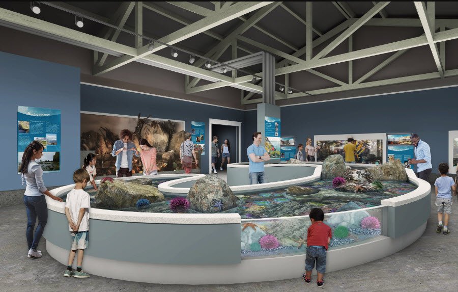 Highlights include the "Passages of the Deep" tunnel showcasing 1.32 million gallons of ocean habitats with sharks, rays, and rockfish, a large outdoor seabird aviary housing puffins, murres, and auklets, and touch pools where visitors can interact gently with sea stars and anemones.