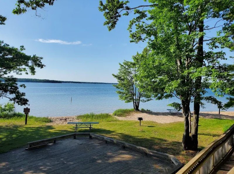 The park centers on a long, shaded sandy beach about half a mile in length, with a designated swim area, an accessible fishing pier, and a quarter‑mile pathway plus picnic spots under large oak, maple, and pine trees. Visitors can swim, fish, or launch boats and small watercraft from the seasonal boat‑access site, while the park’s campground provides shaded sites close to the water, and the nearby Iron Belle Trail adds options for biking, hiking, and winter snowmobiling along the lakeshore.