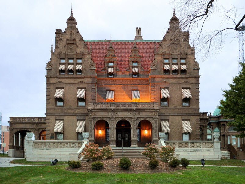 Designed in the Flemish Renaissance Revival style by architects George Bowman Ferry and Alfred Charles Clas, the mansion spans about 20,000 square feet and exhibits detailed woodwork, stained glass, wrought iron, and original furnishings alongside a notable collection of fine and decorative arts.